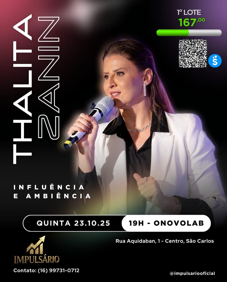 No dia 23/10, em São Carlos, vamos viver uma experiência única com Thalita Zanin, referência em influência, carreira e ambiente estratégico.
